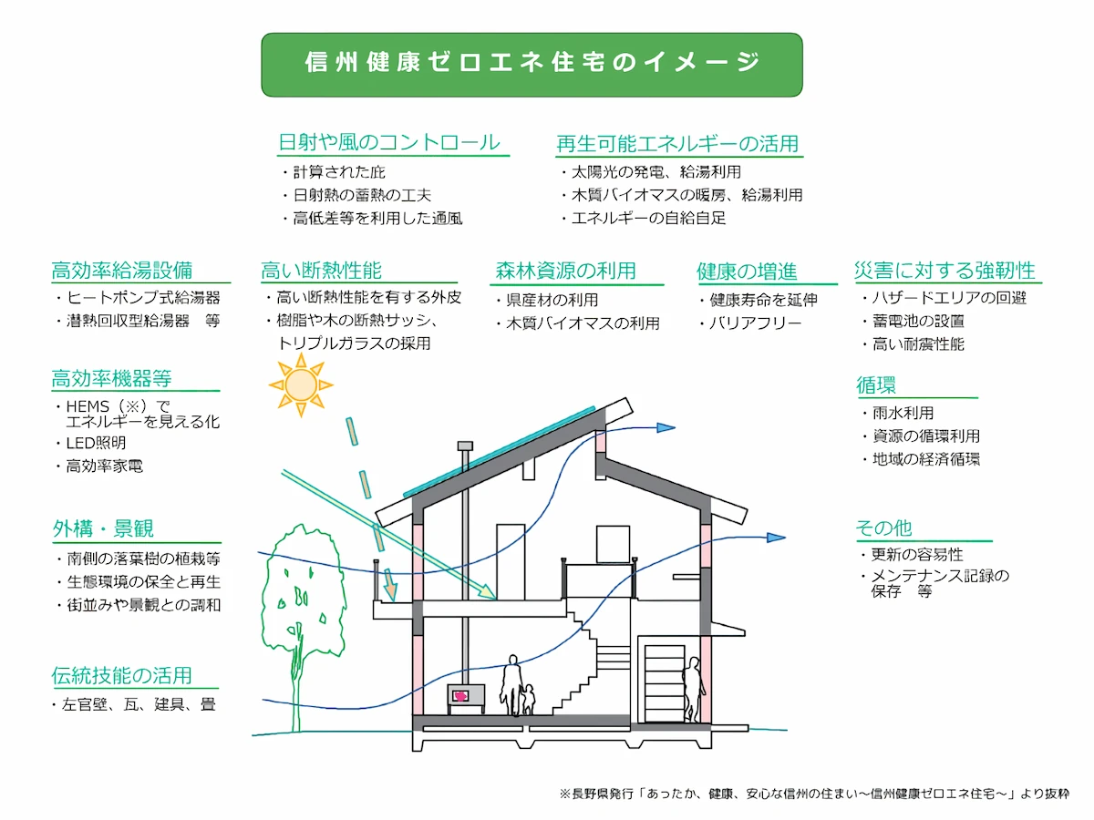 信州健康ゼロエネ住宅は高い断熱性能を有し、信州の恵まれた自然環境と森林資源を活かし、エネルギー使用量を実質ゼロにすることなど、これからの時代を真剣に考えた人と環境にやさいい魅力的な木造住宅です。