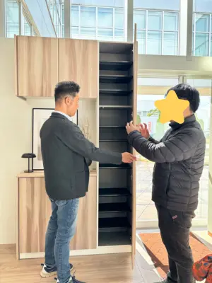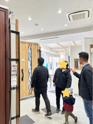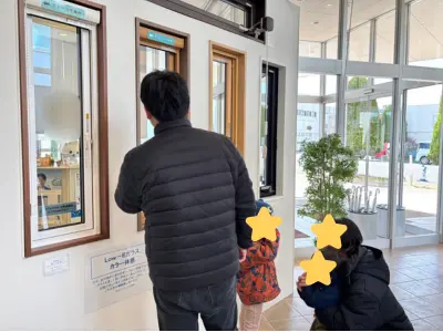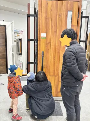 お子様たちは、玄関のハンドルに手を伸ばして「届くかな?」と高さを確かめたり、ショールームの中で楽しみを見つけて元気いっぱい。ご夫婦は交代でお子様と遊びながら打合せを行うスタイルに。そんな姿も微笑ましく、家づくりの現場ならではの光景です。
