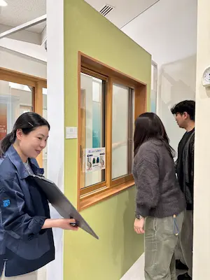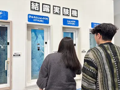 まずは結露実験機の説明をショールームアドバイザーの方から受けました。Y様邸では断熱窓の交換と内窓を付けます。現在はアルミの窓が付いています。樹脂窓にするとどのくらいの体感温度が違うのか、実際に窓に触れて確かめてもらいました。窓の表面には温度計も付いていますので、数値的な違いは見てすぐわかります。実際に触ってもらうと更にその温度差が体感で分かりやすくなります。
