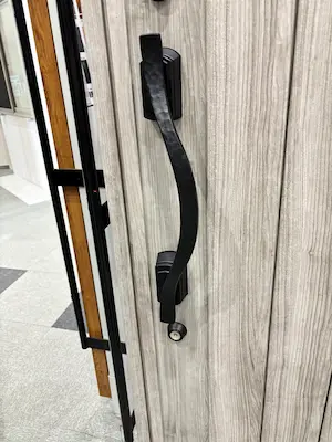 最後に玄関ドアのハンドルデザインを決めました。アイアンのようなカーブのあるかわいいデザインのハンドルをお選びいただきました。玄関の色は窓枠の色に合わせることにしました。家全体の色のバランスと玄関ドアのデザインがうまく決まりました。