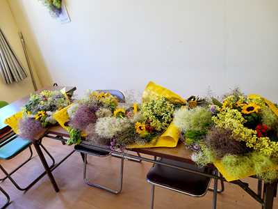 私は、フラワーアレンジメント教室に通っています。色彩の勉強にもなるし、花も好きだからです。社長も一度フラワーアレンジメントをしてみたいとのことで、一緒に教室に参加することになりました。この時期は暑いので、今回のフラワーアレンジメントの形は、ドライフラワーになる「スワッグ」でした。スワッグとは、ドイツ語で「壁飾り」を意味する言葉です。