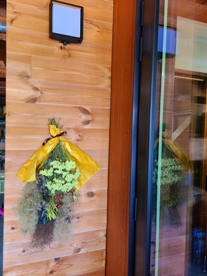 社長は自分が作ったスワッグを、風水で良いと言われている場所に飾ることにしました。会社の入口の袖壁です。この壁はちょうど、西日も当たる場所です。今回のスワッグには仕事運がアップする紫のスモークツリーが入っています。これで会社の運気が上がるか?ですが、今のノリアホームのお仕事依頼は良いお客様に恵まれています。これから出会うお客様とも、理想とする家づくり、信頼できる関係を築き良いお付き合いをしていきたいと思います。