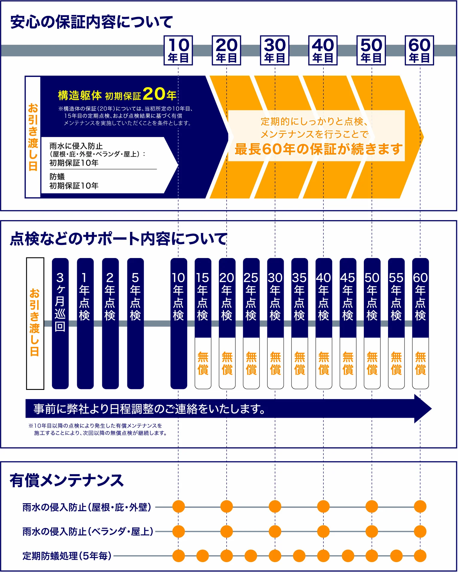 構造躯体・雨水の浸入防止・防蟻について、初期保証として10年間が保証されています。 その後、定期的に点検・メンテナンスを実施して有償アフター工事を行うことにより、最長60年の保証が続きます。