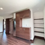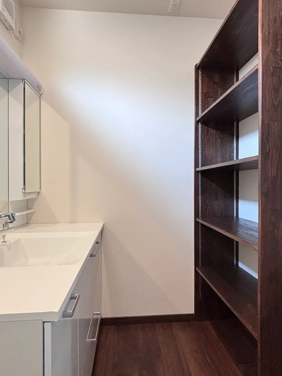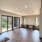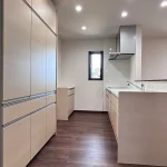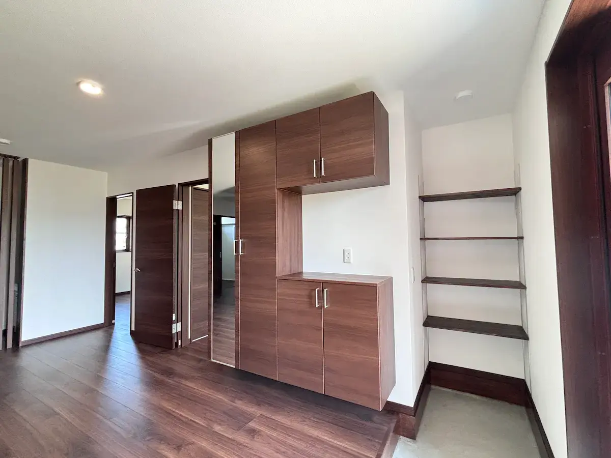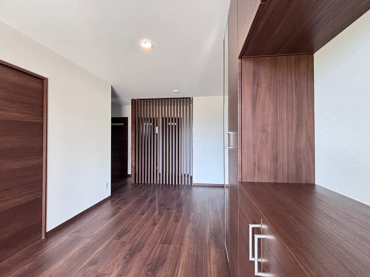 内装は淡いグレーの壁紙クロスを中心にまとめています。造作木部には自然塗料「いろは」を使用し、木の温もりが感じられる空間になりました。やわらかい色合いが、毎日の暮らしを心地よく支えてくれます。床材には三協アルミ「Sフロア ブラウンナット調」を採用。壁紙や建具、造作家具との相性が良く、統一感のあるインテリアに仕上がっています。広々としたLDKと多目的に使える和室が使いやすい間取りとなっています。生活動線に配慮し、収納力も確保した、暮らしやすい住宅となりました。
