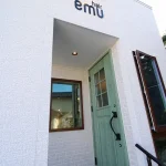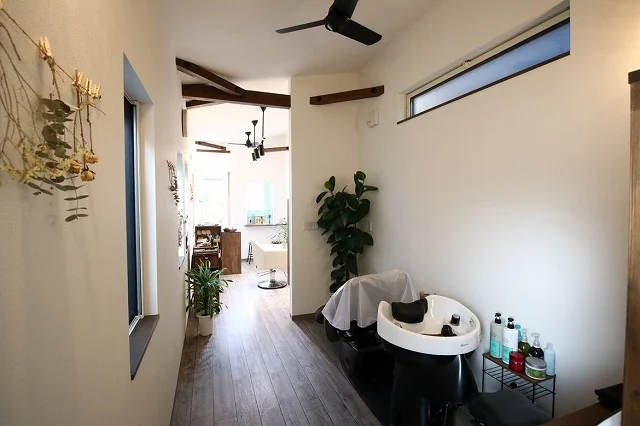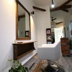 可愛らしいグリーンのドアが出迎えてくれる、心落ち着く空間のおしゃれな美容室